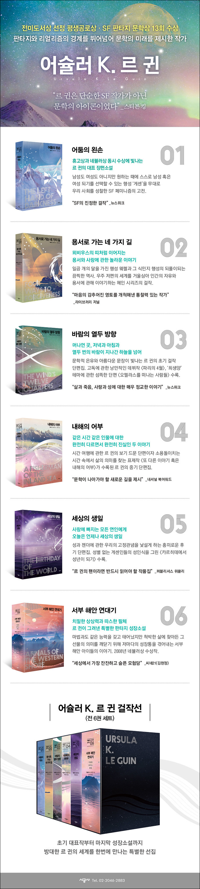 작가로서의 명성을 확고히 한 대표작이자 SF 페미니즘의 고전 <어둠의 왼손>부터, 인간의 자유와 용서에 관한 헤인 시리즈 소설집 <용서로 가는 네 가지 길>, 초기 걸작 단편집 <바람의 열두 방향>, 시간 여행을 다룬 중기 단편집 <내해의 어부>, 성에 관한 고정관념을 흔드는 후기 단편집 <세상의 생일>, 노년의 대작가가 된 르 귄이 마지막으로 들려주는 판타지 성장소설 <서부 해안 연대기>까지, 평생에 걸쳐 한결같이 놀라운 이야기로 독자를 감동시켜온 르 귄의 따뜻하고 섬세한 작품 세계를 한꺼번에 만날 수 있다.
